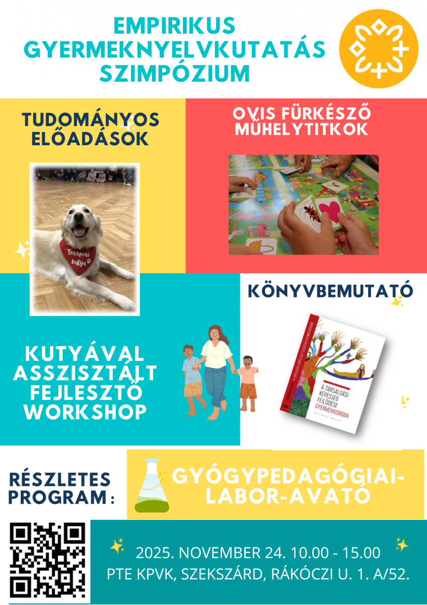 A Pécsi Tudományegyetem Kultúratudományi, Pedagógusképző és Vidékfejlesztési Karának Illyés Gyula Pedagógusképző Intézete és a Tipikus és Atipikus Gyermeknyelvfejlődési Kutatócsoport 2025. november 24-én Empirikus gyermeknyelvkutatás címmel szimpóziumot szervez. A rendezvény célja, hogy platformot teremtsen a témában kutató, vagy az iránt érdeklődő hallgatók, oktatók, (gyógy)pedagógusok és szakemberek számára, segítsen az aktuális kutatási eredmények megismertetésében, együttműködések kialakításában. A szimpózium interdiszciplináris jellegű, a gyógypedagógia, a pedagógia, a nyelvészet, a kommunikáció, a kétnyelvűség és az anyanyelv-elsajátítás területeit integrálja. A programban előadóként a PTE KPVK hallgatói, oktatói, a kutatócsoport tagjai, a PTE IGY Gyakorló Általános Iskola pedagógusai, valamint meghívott előadók vesznek részt. A szimpóziumon való részvételhez az online csatlakozás lehetőségét biztosítjuk. Az esemény a Magyar Tudomány Ünnepe alkalmából kerül megrendezésre, és kapcsolódik a Magyar Tudományos Akadémia alapításának 200. évfordulója alkalmából meghirdetett emlékévhez.