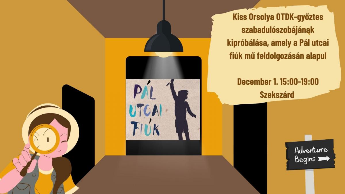 December 1. 15:00-19:00 Szekszárd Kiss Orsolya OTDK-győztes szabadulószobájának kipróbálása, amely a Pál utcai fiúk mű feldolgozásán alapul